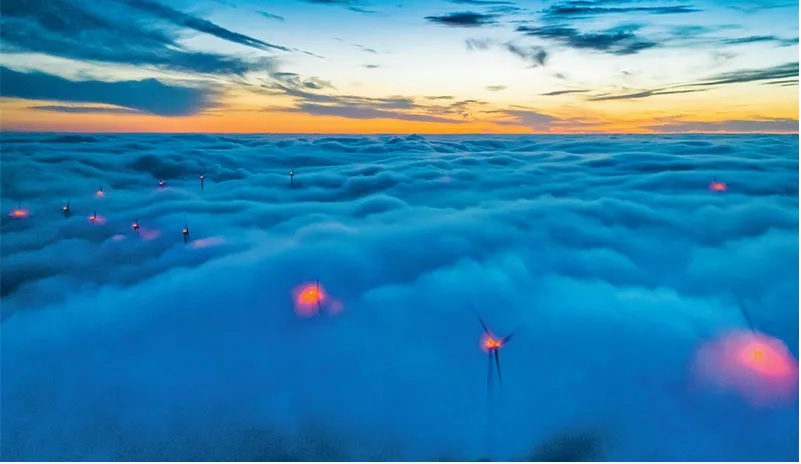 近年來(lái),各地立足資源稟賦,加快清潔能源開(kāi)發(fā)利用,推動(dòng)發(fā)展方式綠色低碳轉型。圖為2023年2月23日晚,在湖北省宜昌市秭歸縣兩河口鎮云臺荒村拍攝的風(fēng)力發(fā)電機組(無(wú)人機照片)。新華社發(fā) 鄭家裕/攝